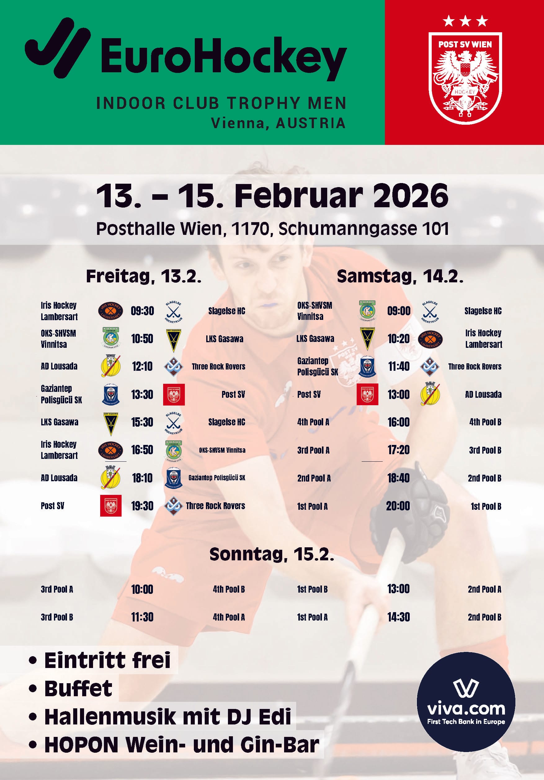 Mit der EuroHockey Indoor Trophy der Herren richtet der Post SV Wien vom 13. bis 15. Februar 2026 eines der bedeutendsten europäischen Clubturniere im Hallenhockey aus und empfängt Topteams aus ganz Europa in der Bundeshauptstadt.